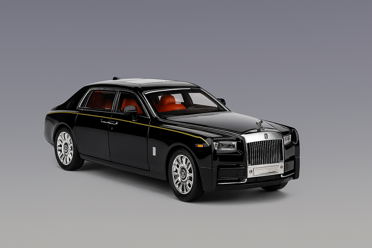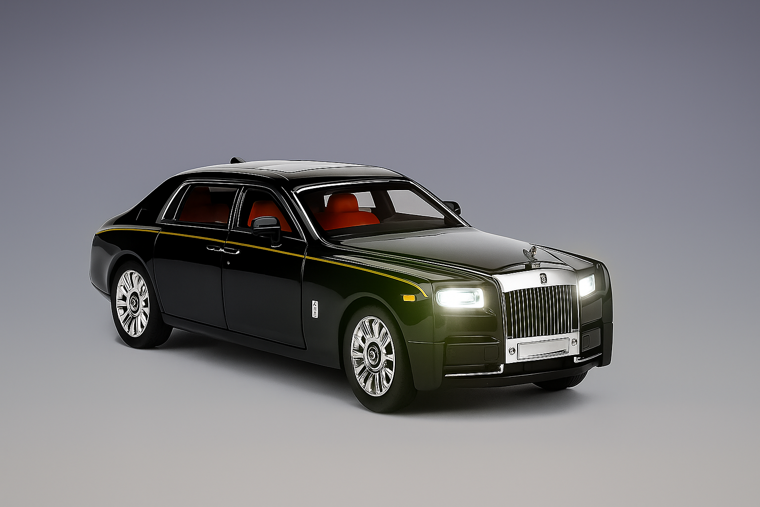 Crafted with precision and luxury in mind, this scale model of the Rolls-Royce Phantom exudes unmatched elegance and metallic grandeur. The body is cast in high-grade die-cast metal, delivering a solid, weighty feel that mirrors the authority of its real-life counterpart. A flawless gloss black finish is accented with a hand-applied gold pinstripe, showcasing elite craftsmanship.